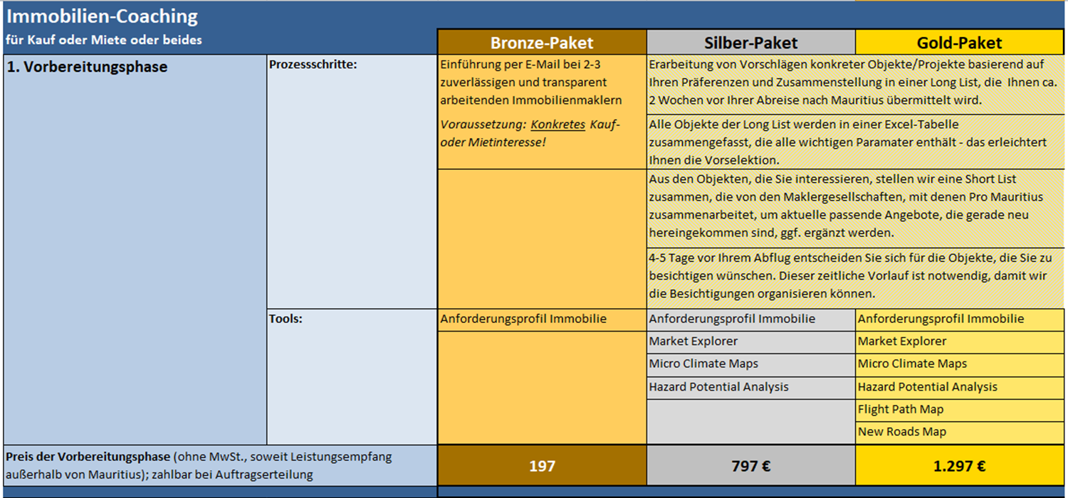 Bei der Beratung zum Kauf (oder auch Anmietung) einer Immobilie in Mauritius biete ich folgende Pakete an: