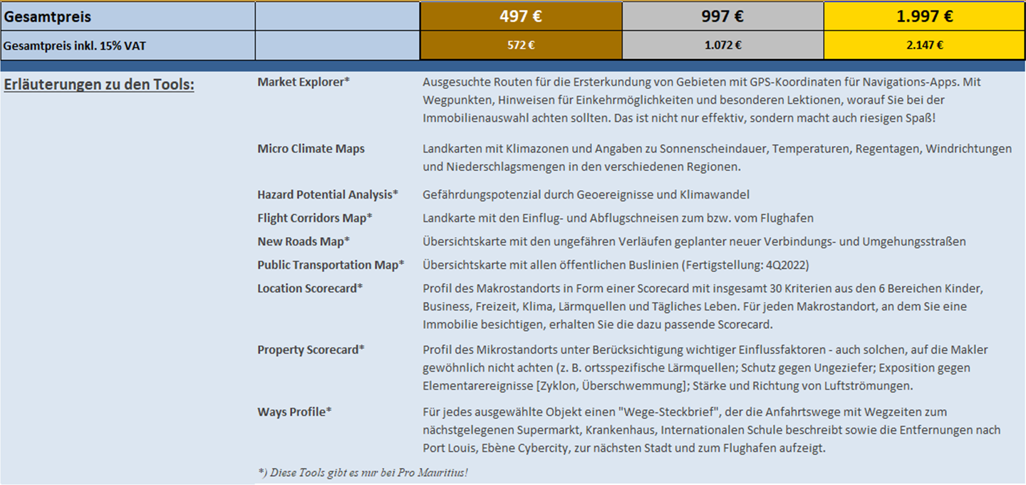 Bei der Beratung zum Kauf (oder auch Anmietung) einer Immobilie in Mauritius biete ich folgende Pakete an: