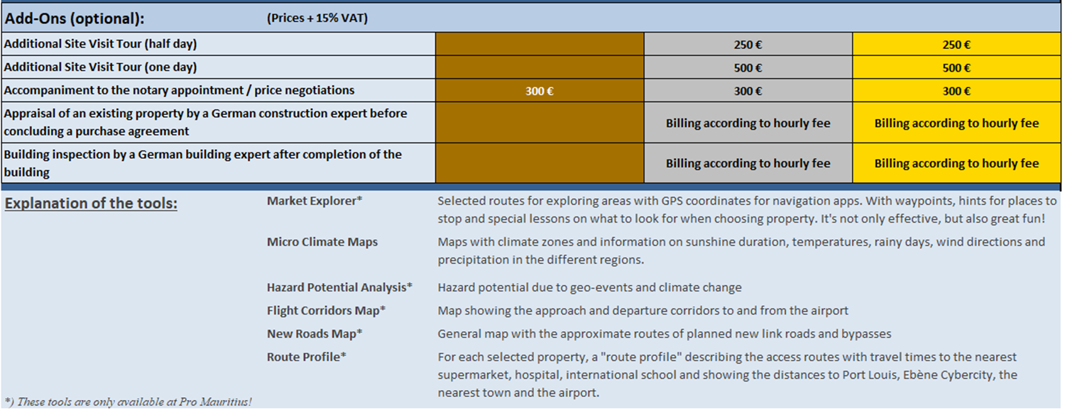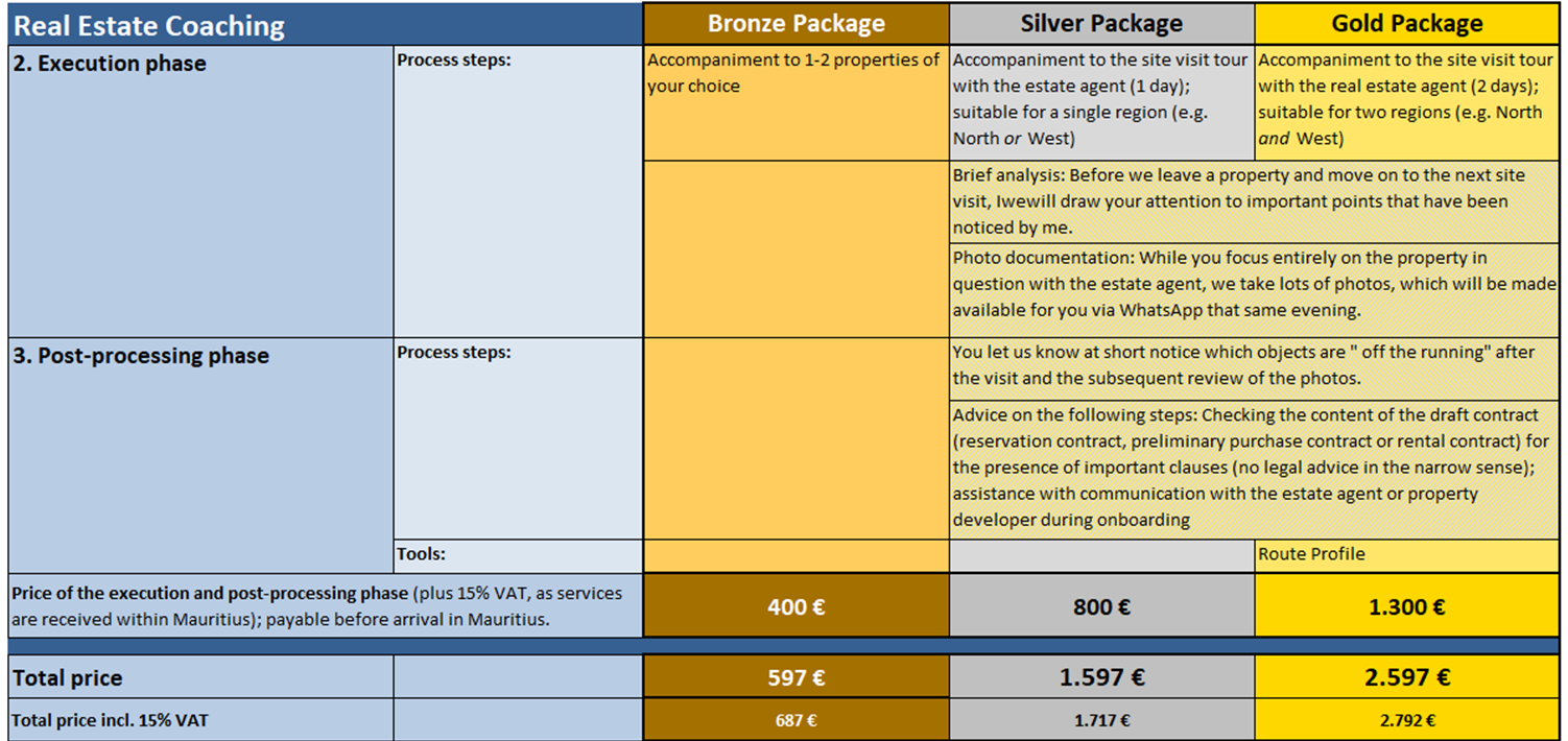 I offer the following packages when consulting on the purchase of real estate in Mauritius: